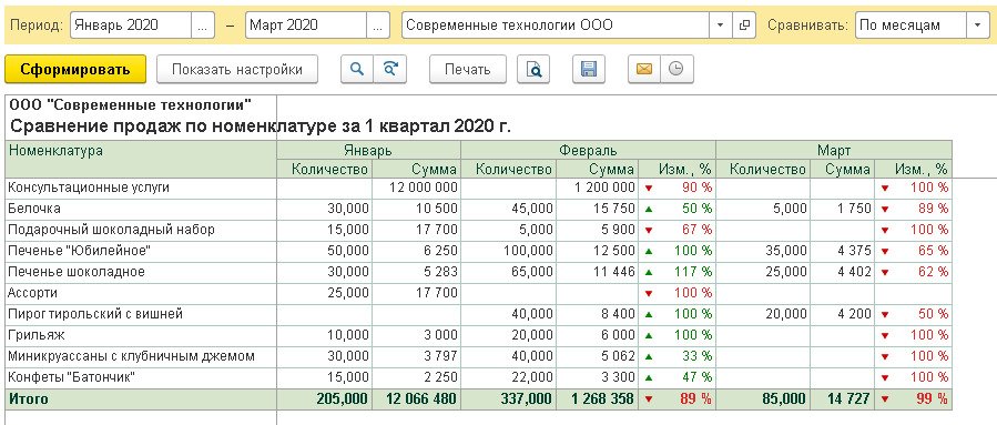 Программа имеет настройки, благодаря которым можно проводить сравнение продаж по месяцам, кварталам или годам.