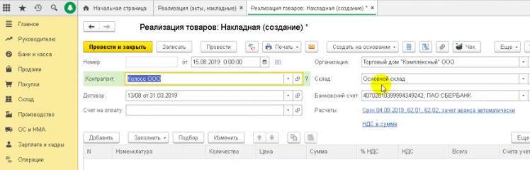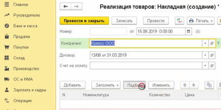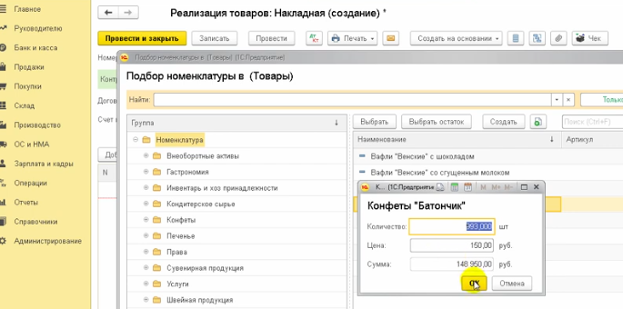 В форме выбора номенклатурной позиции автоматически заполняется ее количество, имеющееся на складе, цена продажи и общая сумма