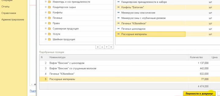 Номенклатура переносится в таблицу подобранные позиции. Можно выбирать сразу несколько наименований номенклатуры. Нажимаем кнопку control, не отпуская ее выделяем мышью нужные позиции и перетаскиваем в таблицу подобранные позиции