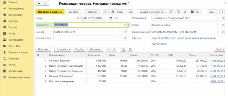 Остатки номенклатуры и цена продажи заполнены автоматически. Нажимаем на кнопку перенести в документ. Табличная часть заполнена