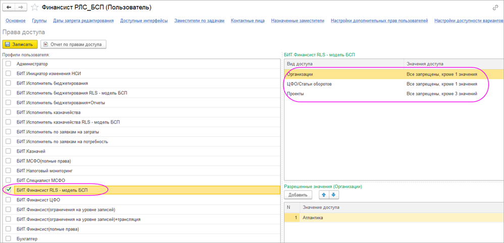 Настройка прав доступа на уровне записей, механизм RLS «1С:БСП» в БИТ.ФИНАНС