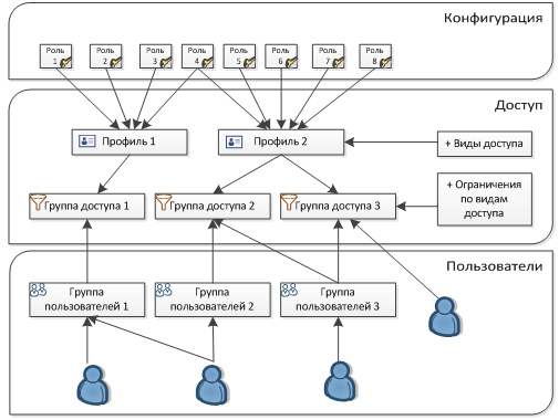 Система уже содержит готовый набор профилей, которые можно использовать как есть или адаптировать под структуру компании. Каждый профиль задает доступ к определенным подсистемам и объектам.