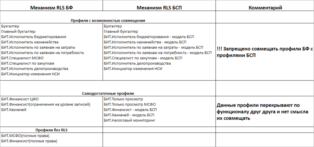 Важно учитывать, что профили на базе БСП не рекомендуется использовать вместе с другими профилями БИТ.ФИНАНС: это может привести к конфликтам ограничений. Перед их использованием необходимо выполнить регламентное задание по заполнению данных для ограничения доступа.