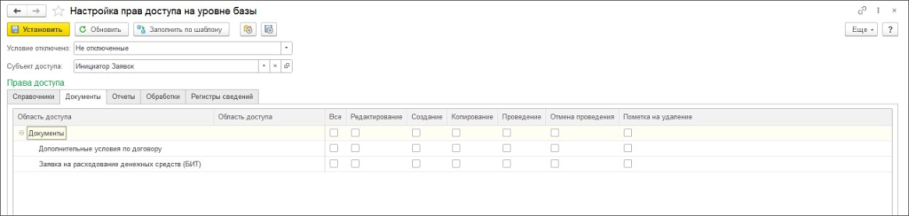 Первый уровень — доступ на уровне базы. Система задает правила, что пользователь может делать с объектом системы. Например, есть заявка на расходование ДС. Настройка прав доступа на уровне базы позволяет ограничить или выдать права пользователю на: редактирование, создание, копирование, проведение, отмену проведения и пометку на удаление документа.