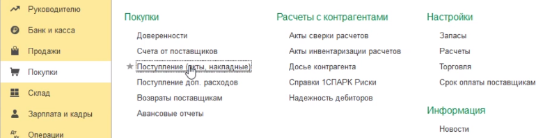 Для этого идем в раздел покупки / Поступление (акты, накладные).