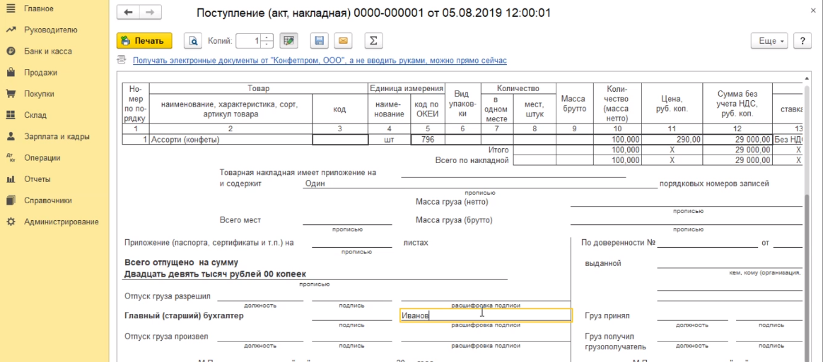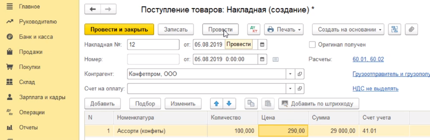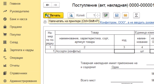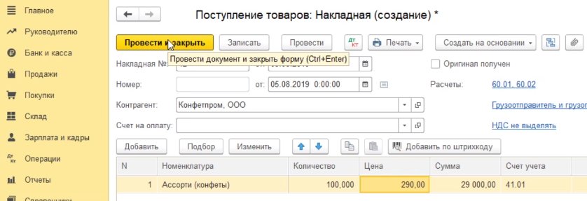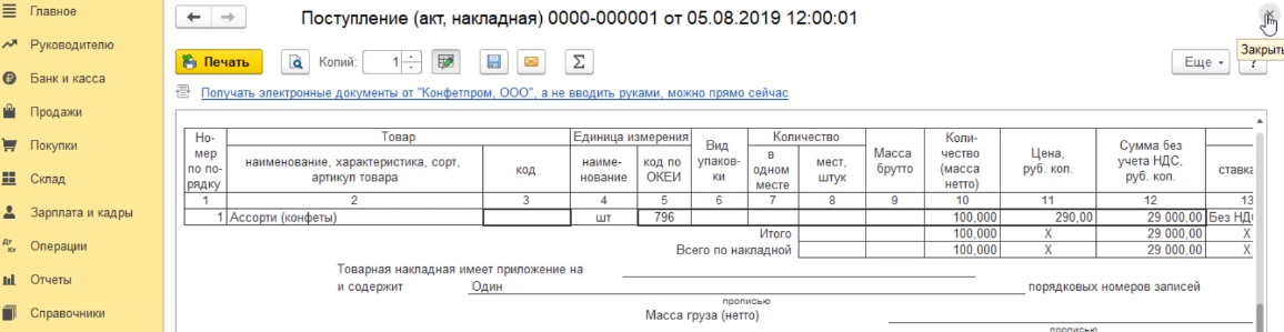 Программа проведет документ и закроет нашу форму для заполнения. Если же мы хотим распечатать этот документ, то мы должны провести его без закрытия формы - нажимаем на кнопку провести. Программа провела документ.