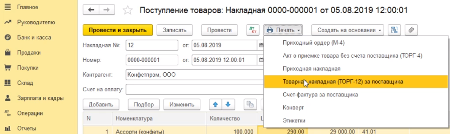 Далее нажимаем по кнопочке печать и можем распечатать необходимый вариант. В нашем случае товарная накладная (ТОРГ-12) за поставщика.
