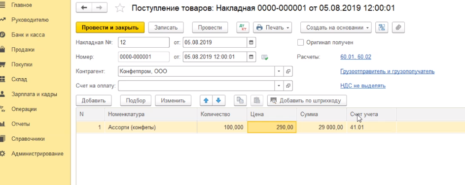 В нашем примере мы в качестве демонстрационной выбрали организацию, которая находится на упрощенной системе налогообложения, поэтому в документе НДС не выделялся.