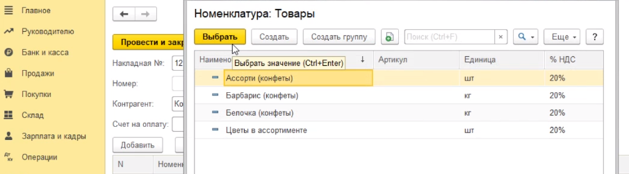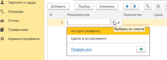 Далее в документе заполняем табличную часть товарами, которые мы получили по накладной. Через кнопочку добавить, выбрать из списка, показать все - выбираем конкретную номенклатуру.