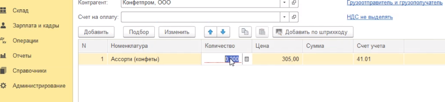 Указываем количество номенклатуры - сто штук.