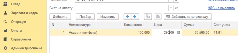 Цена автоматически подставилась программой - это та цена, которую мы в последний раз указывали в документе поступления. Если цена отличается, мы можем ее вручную отредактировать и поставить ту цену, которая реально в документе. Например, двести девяносто рублей.