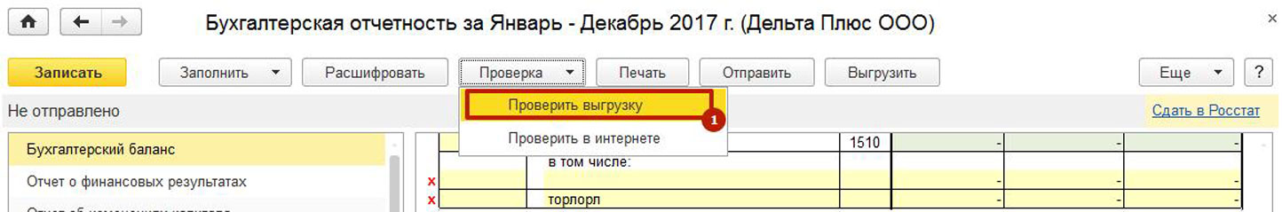 После того как весь отчет будет сформирован, все изменения и корректировки в него будут внесены, необходимо запустить процедуру проверки, перед тем как отправить его в налоговые органы. Для этого нажимаем на кнопку «Проверка» и далее в контекстном меню выбираем «Проверить выгрузку», после чего программа 1С автоматически начнет проверку всех произведенных настроек.
