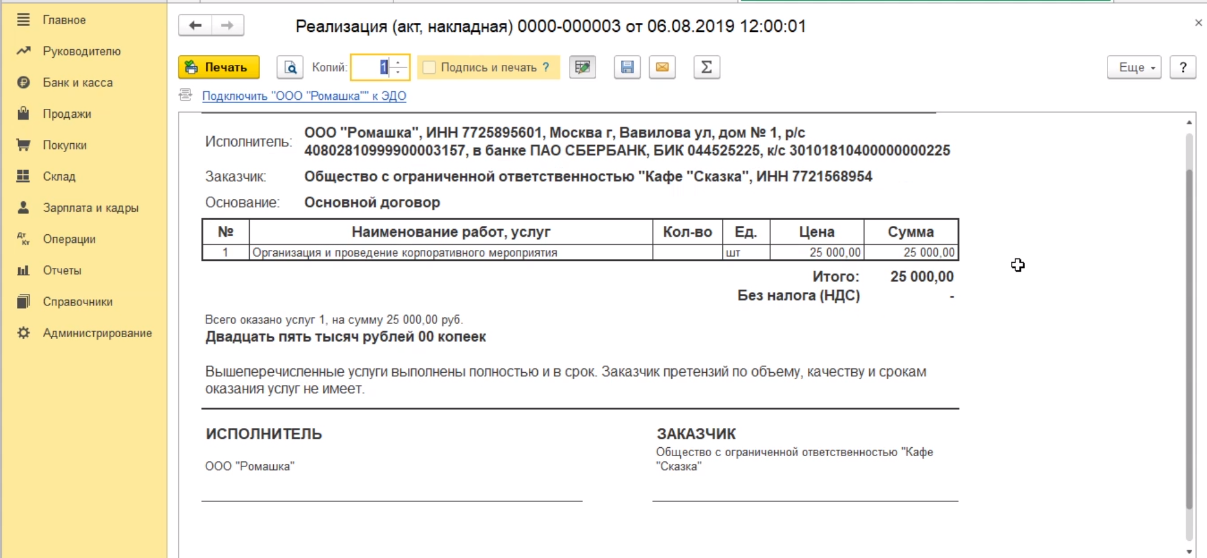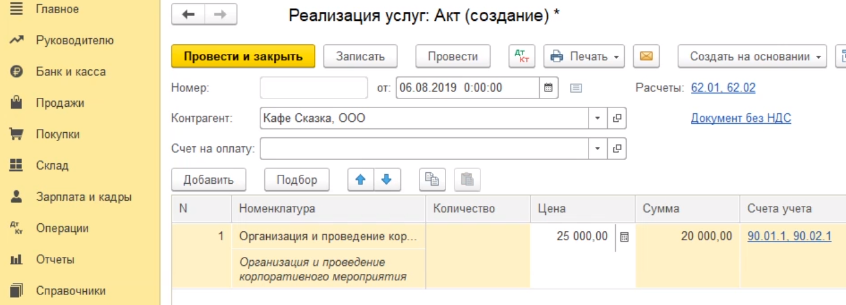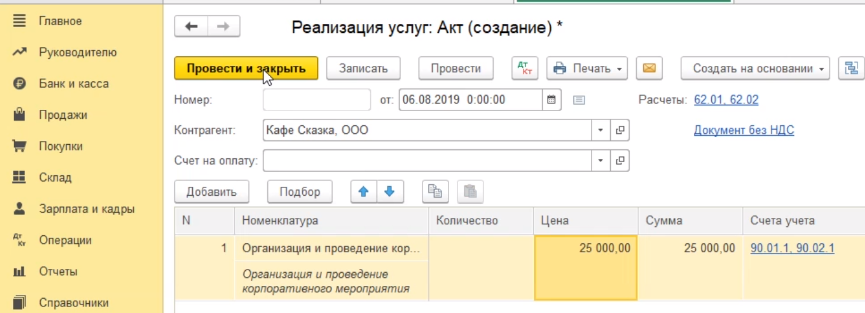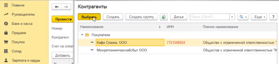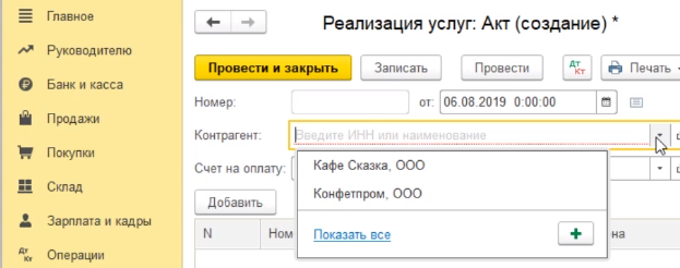 Выбираем ООО кафе "Сказка" и переходим к заполнению табличной части, в которой мы непосредственно должны указать ту услугу, которую мы покупателю оказали.