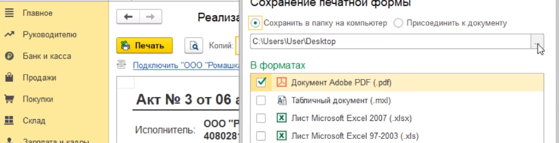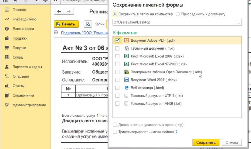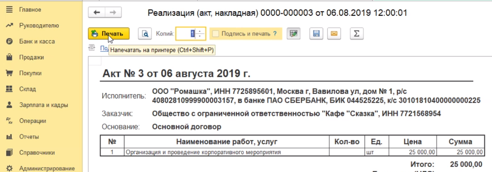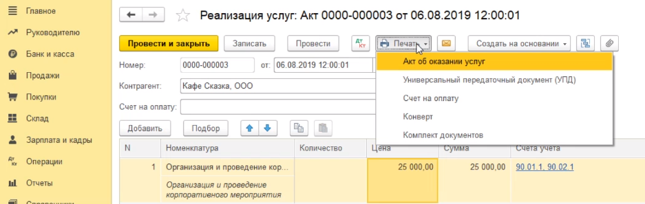 Затем переходим в печатную форму. Выбираем акт об оказании услуг.