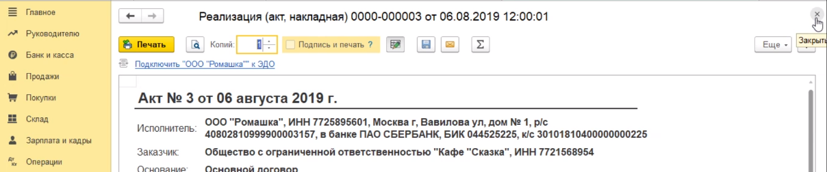 После окончания работы с документами мы закрываем его кнопочкой закрыть в виде крестика и тоже самое делаем с документом реализация.