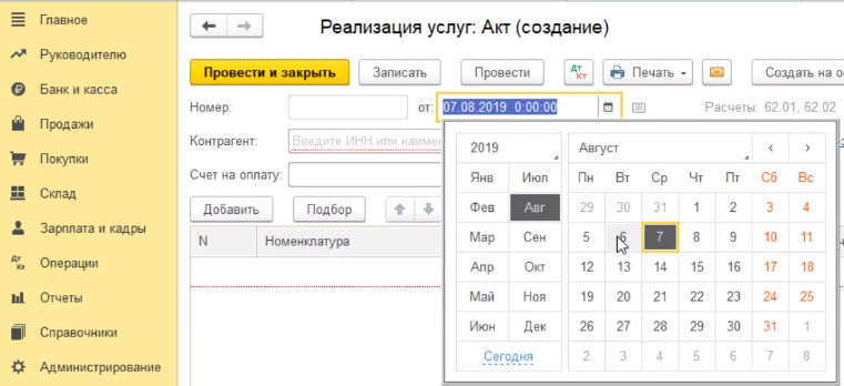 Открывается форма для заполнения. Дату документа программа проставляет автоматически - это текущая рабочая дата компьютера. Если необходимо дату изменить, то мы можем это сделать сразу здесь в документе с помощью встроенного календарика. Выбираем дату, например, шестое августа.