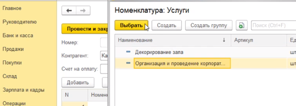 Видим, что представлены программы на выбор. Номенклатура услуг, которые мы оказываем нашим покупателям. Например, выбираем организация и проведение корпоративного мероприятия. Нажимаем кнопку выбрать.