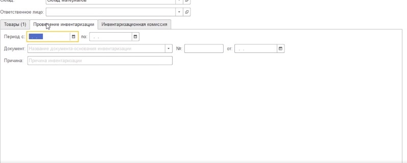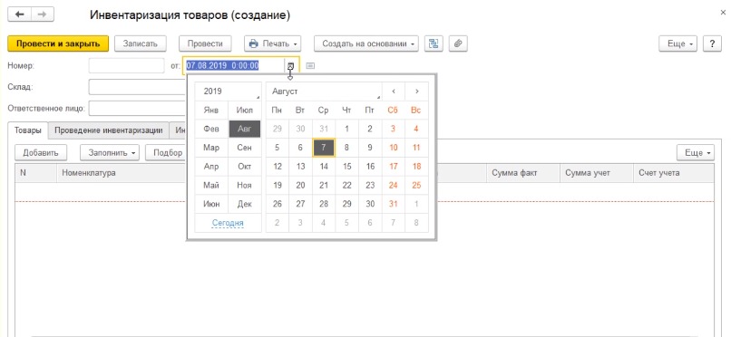 Здесь мы должны с вами указать дату, на которую мы проводим инвентаризацию на складе, например, пускай это будет сегодняшнее число