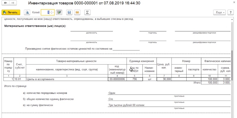 Документ инвентаризации готов. Можно вывести его на печать через кнопку печать, инвентаризационная опись товаров