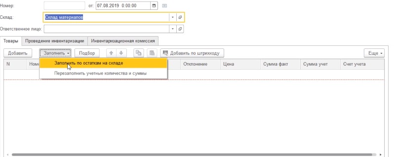 Далее по кнопочке заполнить в табличной части, просим программу заполнить табличную часть данными по учету товаров на складах (заполнить по остаткам на складах)