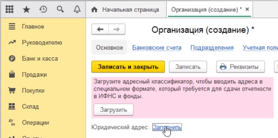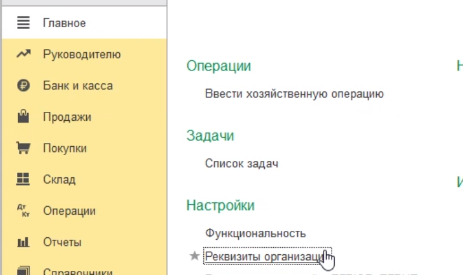 Для ввода реквизитов организации требуется перейти по пункту меню главное и перейти по ссылке реквизиты организации.
