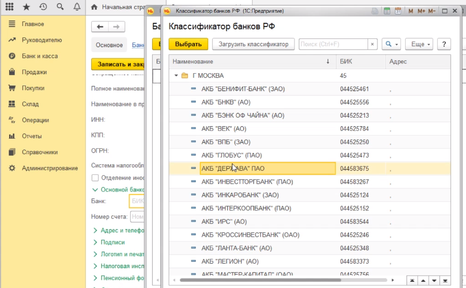 Классификатор изначально в программу подгружен. Выбираем нужный нам банк и вводим номер счета.