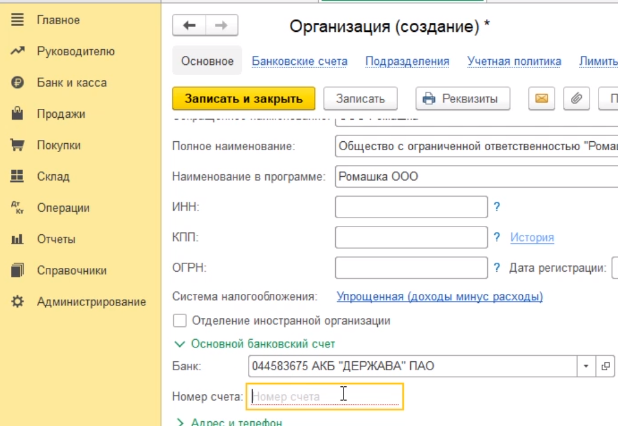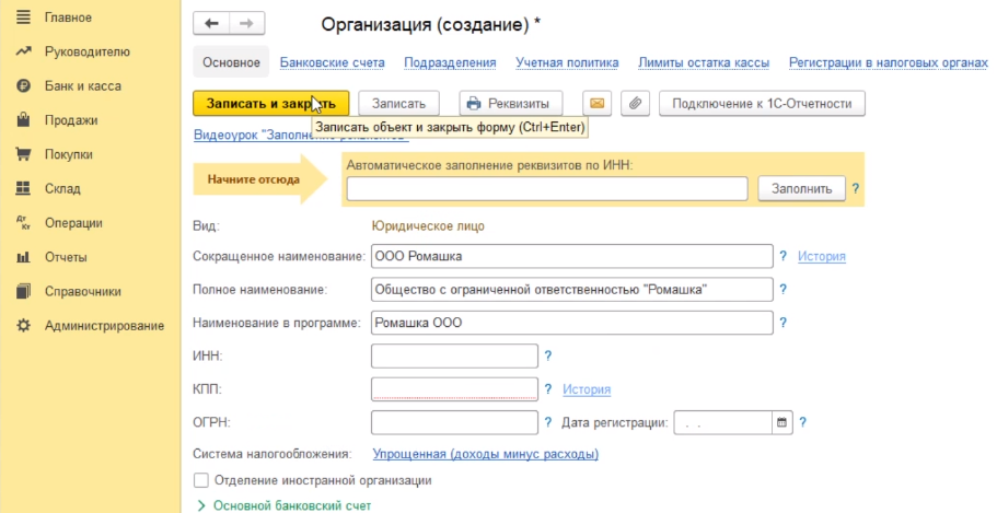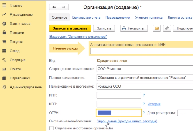 Далее вводим ИНН, КПП и ОГРН нашей организации. Система налогообложения вводится автоматически, так как мы до этого ее с вами выбрали.