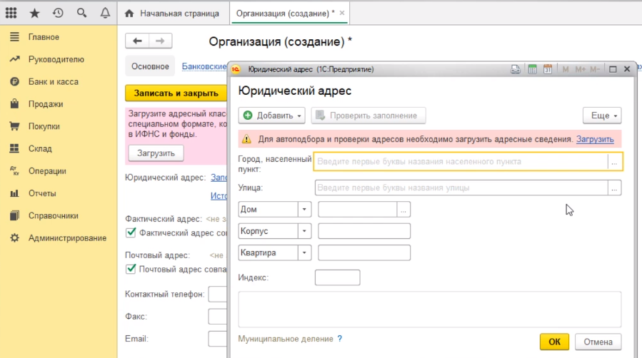 Далее следует ввести оставшиеся сведения об организации. В принципе вам не обязательно это делать сразу же. Вы можете ввести эти данные позже, можете ввести сразу же. Переходим по ссылке адреса и телефоны.