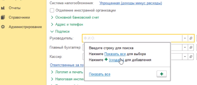После того, как мы ввели информацию об адресах и телефонах, переходим в пункт меню подписи и заполняем руководителя, главного бухгалтера и кассира.