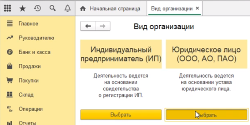 Далее выбираем вид организации - индивидуальный предприниматель или юридическое лицо.