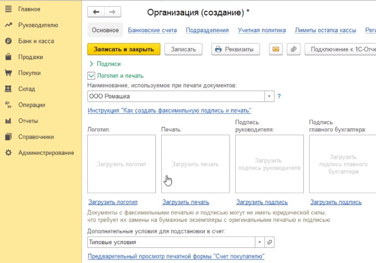Данный раздел нужен для того, чтобы подгрузить логотип и печать, которые будут отображаться в печатных формах наших документов.