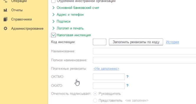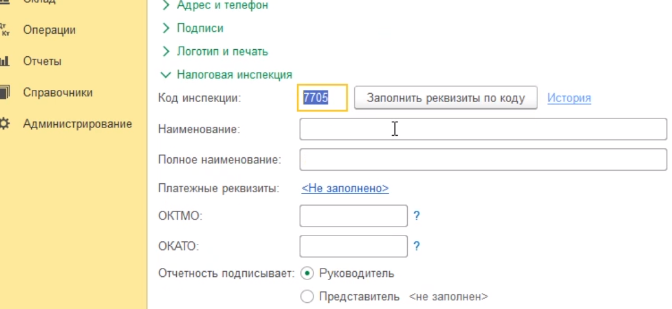 Как только мы ввели код инспекции, программа дает возможность ввести наименование, полное наименование, ОКТМО и ОКАТО. Нужно это заполнять для того, чтобы в отчетности заполнялась налоговая, в которой будет сдаваться собственно отчетность на титульном листе.