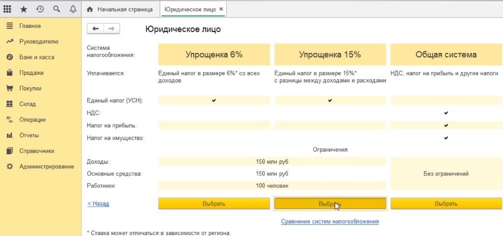 Для примера рассмотрим ситуацию, когда у нас юридическое лицо. После этого следует выбрать систему налогообложения. Упрощенная система - шесть процентов, пятнадцать или общую систему. Данная настройка нужна для учетной политики организации. В будущем эту настройку можно будет изменить. Выберем в данном случае упрощенную систему пятнадцать процентов.