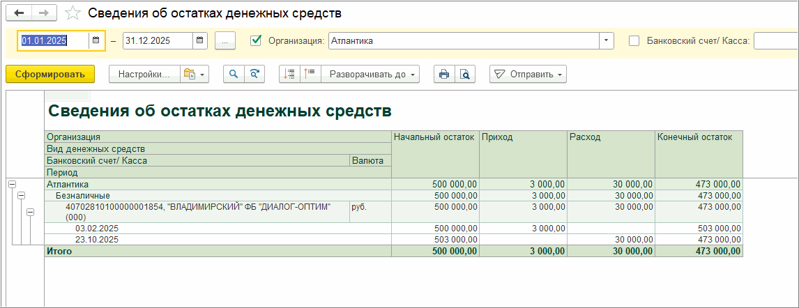 - Контроль остатков денежных средств на расчетных счетах и в кассах организации.
