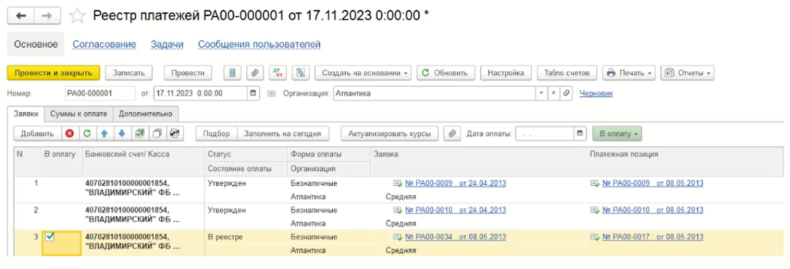 - Формирование реестров платежей, включающих перечень заявок, подлежащих оплате.