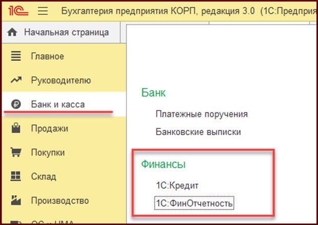 Гиперссылка для доступа к 1С:ФинОтчетность находится в разделах "Банк и касса" и далее в "Финансы".