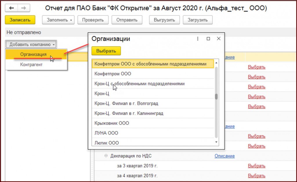 Из заполненной начальной формы "Новый пакет 1С:ФинОтчетности" через кнопку "Создать" можно перейти в форму пакета. Новый пакет формируется для главной компании, входящей в группу. По кнопке "Добавить" пользователь добавляет компании, входящие в эту группу, из справочника: