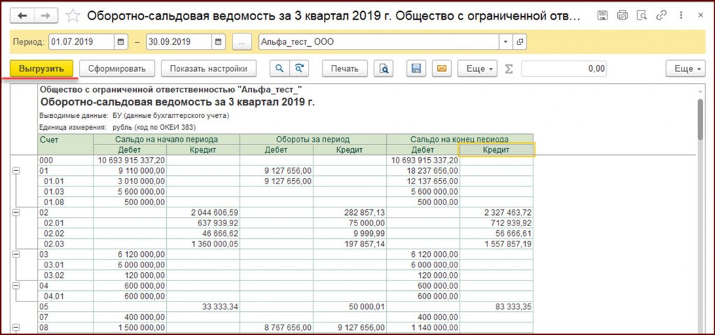 Интерактивное открытие счета, который сформирован по данным из 1С:ФинОтчетность, дублируется кнопкой "Выгрузить". Нажатие на кнопку сохраняет файл и прикрепляет его к пакету отчетности в формате MS Excel.