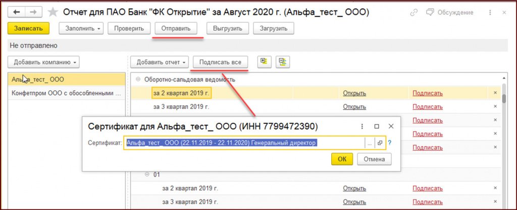 Версия 3.0.82 "1С:Бухгалтерия 8" и последующие предоставляют пользователям новую возможность - отправлять отчетность в закодированном виде непосредственно в банк и другим адресатам напрямую из 1С. Через сервис можно использовать полный список получателей, содержащихся в программе. В отчете консолидируется информация от одной или несколько компаний или ИП, входящих в группу. Для отправки документа подходит сертификат: 1С-ЭДО, 1С-ЭДО, 1С-Отчетность.