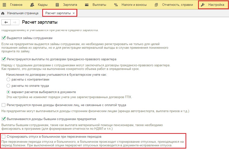 Если порядок действий, о котором рассказывается в этой статье, будет для вас неудобным, можно будет воспользоваться другим методом. Для этого зайдите в раздел «Настройка», кликнув «Расчёт зарплаты» и нажав «Сторнировать отпуск в больничном при пересечении периодов». Этот флаг доступен лишь после версии 3.1.14.