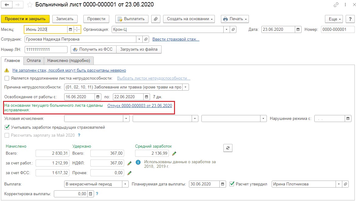 Сделаем документ-исправление и вернёмся к листку нетрудоспособности. Из него исчезнет запись о невозможности осуществить подсчёт. Вместо неё возникнет надпись «На основании текущего больничного листа сделаны исправления», а также ссылка на документ-исправление.