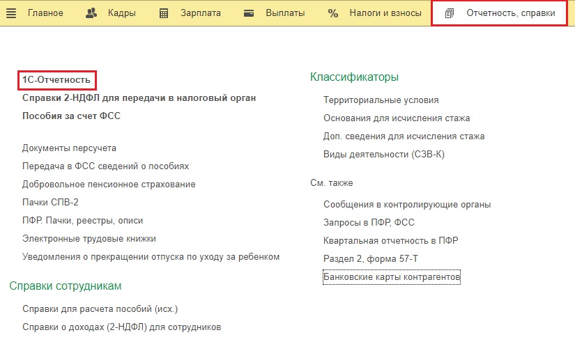 Для этого зайдите во вкладку «Отчётность, справки» и выберите «1С-Отчётность».