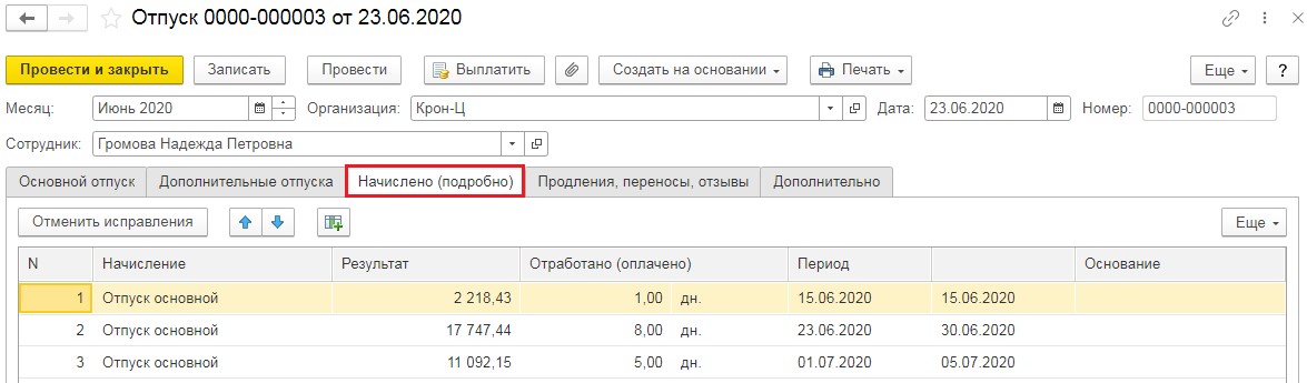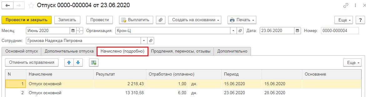 Обратимся к документу «Больничный лист» в то время, когда приложение интересовалось  «Продлить основной отпуск по заявлению сотрудника на 7дн?» и нажмем «Нет». Приложение оформит документ-исправление, но в нем в разделе «Начислено (подробно)» подсчёт бкднт осуществлён лишь за те дни отдыха, которые не были совмещены с больничным. А значит, сумма начислений будет меньше выплаченных средств.
