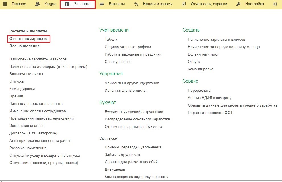 Создадим расчётный листок, чтобы проверить выплаты и начисления. Для этого нужно зайти во вкладку «Зарплата» и нажать «Отчёты по зарплате».