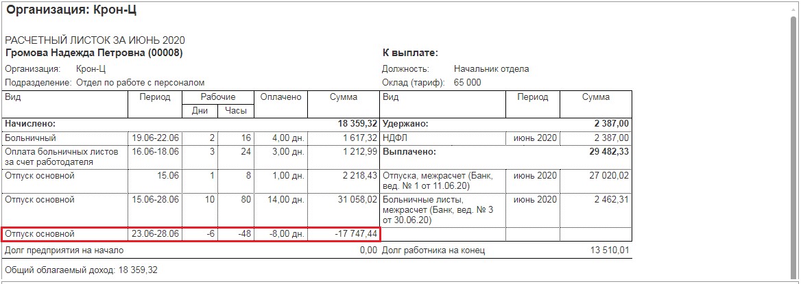 В столбце начислений будет показано сторнирование, то есть частичная отмена начисленных отпускных.