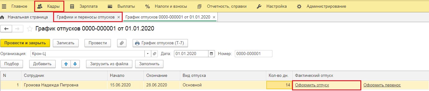 Зайдем в категорию «Зарплата» и кликнем «Отпуска». Если вы до этого внесли документ «График отпусков» в категории «Кадры» - «Графики, переносы отпусков», то оформить документ «Отпуск» можно, зайдя в графике по ссылке «Оформить отпуск».