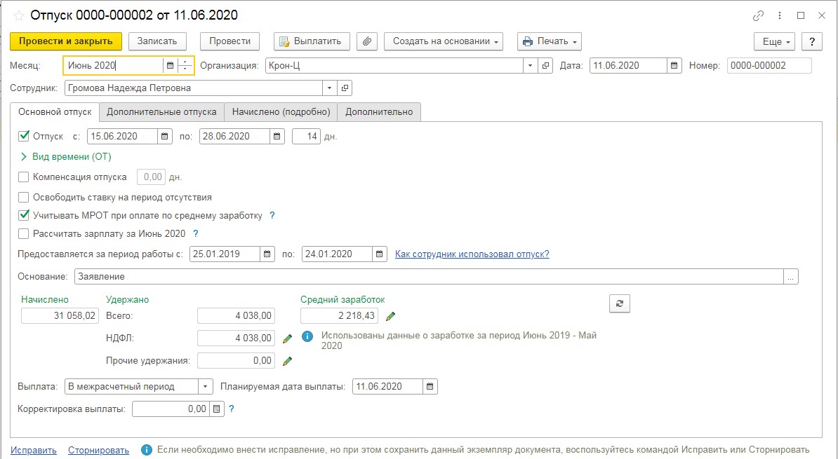 Положительная сторона подобного механизма - возможность при внесении больничного листа, который совмещается с отпуском, внести исправление отпуска с указанием дат, на которые будут перенесены дни или продлён отпуск.