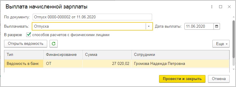 Затем осуществим выплату начисленных сумм. Проще всего сделать это, кликнув «Выплатить» в документе «Отпуск». Программа в автоматическом порядке решит, каким методом осуществляются выплату сотруднику и предложит вам оформить подходящую ведомость.