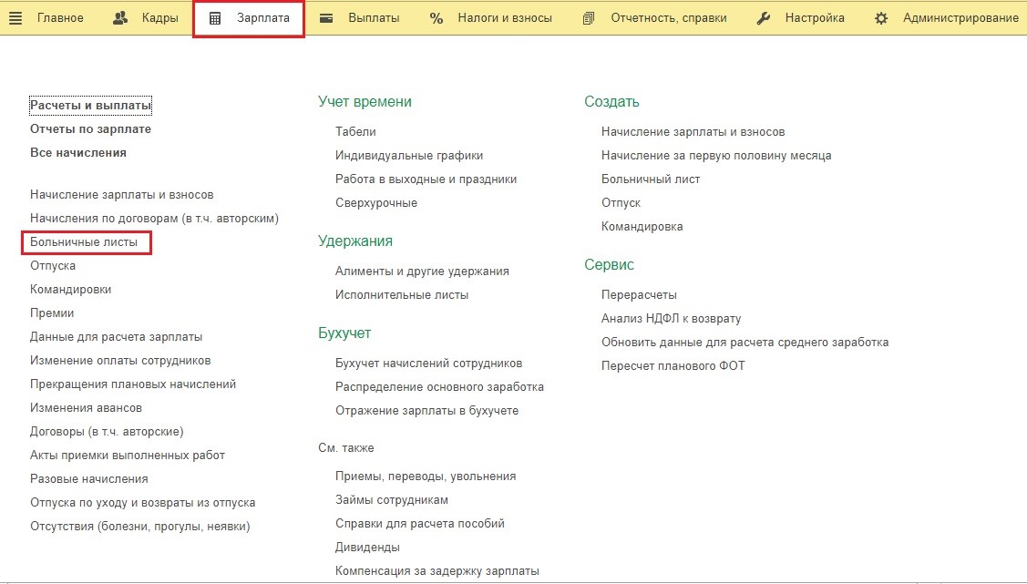Далее начнём внесение больничного. Для этого в категории «Зарплата» кликнем «Больничные листы».
