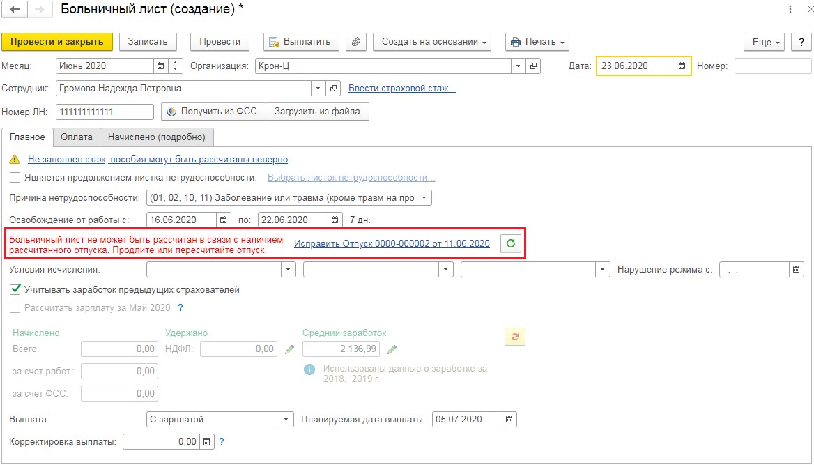 Применяя клавишу «Создать» внесём новый документ. Укажем в нем работника, срок и месяц заболевания, номер больничного и причину нетрудоспособности. Затем в документе возникнет запись, что лист нетрудоспособности невозможно рассчитать, так как он пересекается с отпуском. Возникнет ссылка «Исправить отпуск».